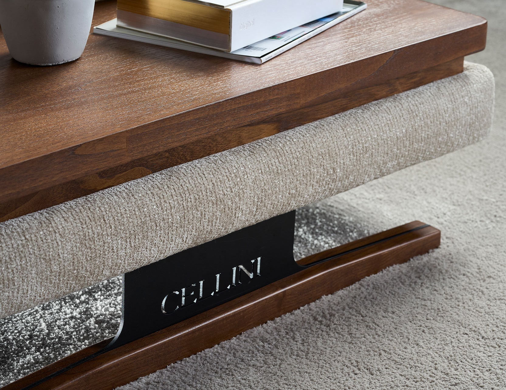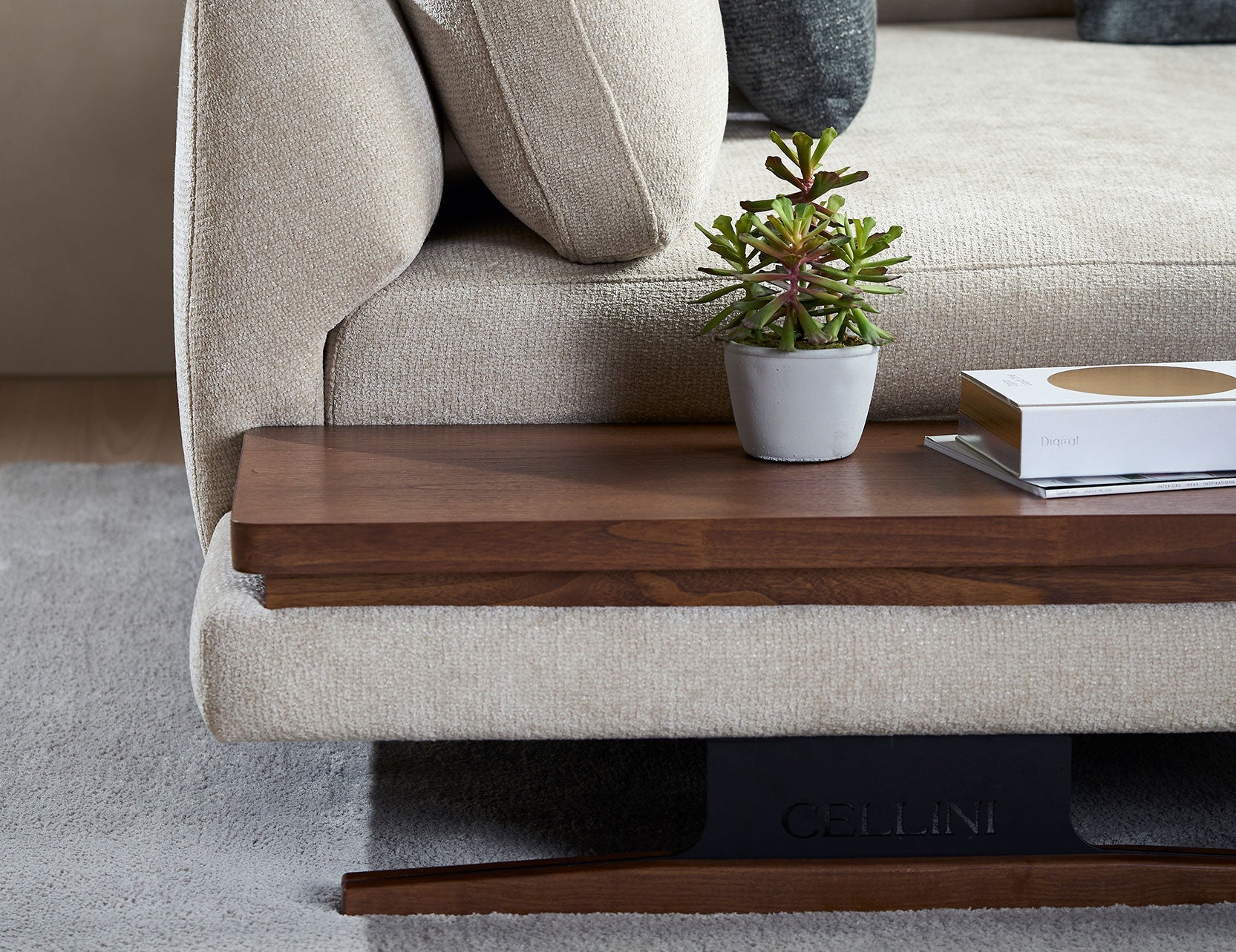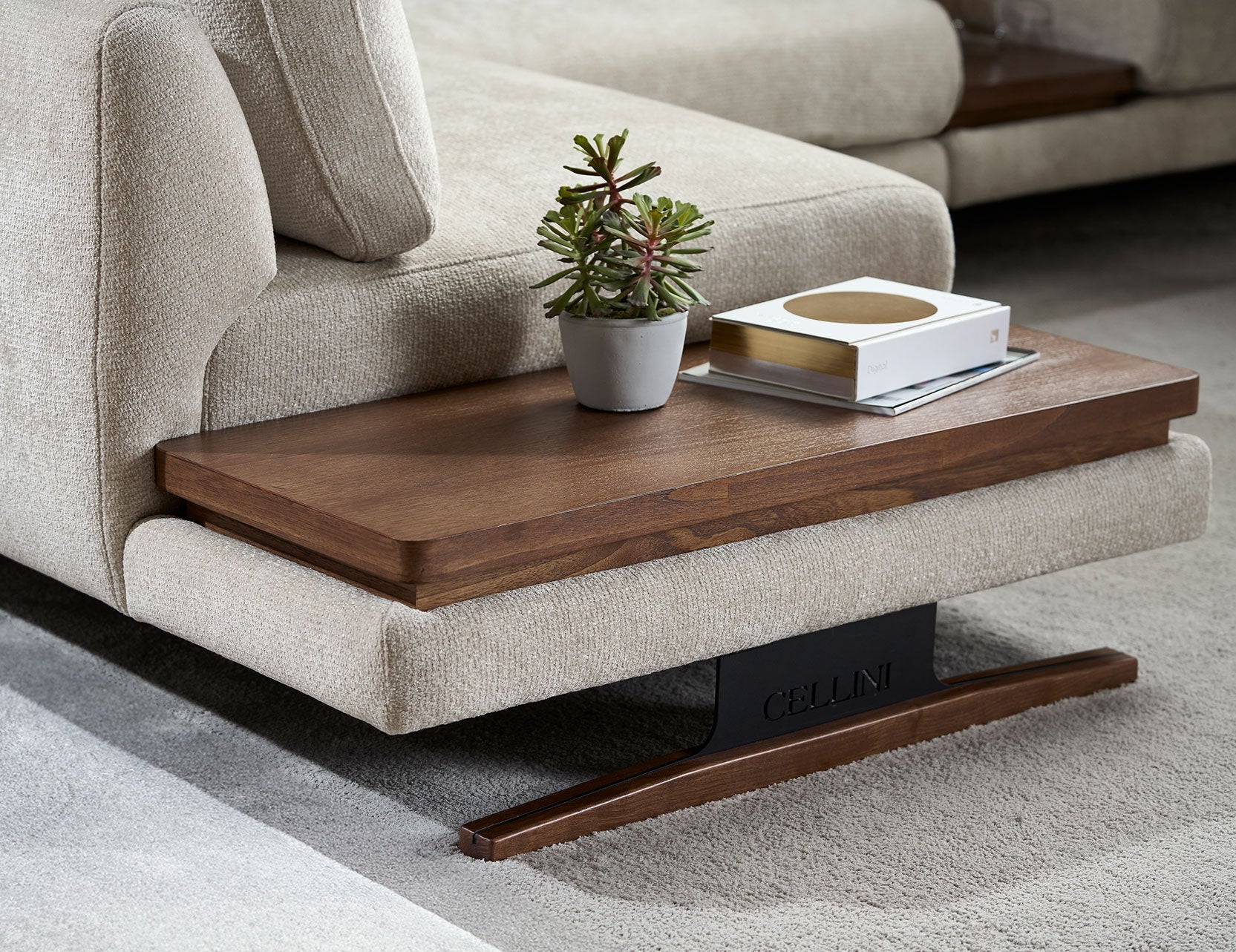 Le canapé modulable nouvellement revisité allie harmonieusement fonctionnalité et style. Chaque module est conçu pour créer une configuration spacieuse pour vos espaces de vie. L'accoudoir est unique grâce à ses housses amovibles à fermeture Velcro pratiques. Grâce à cette fonctionnalité, garder vos meubles élégants et fonctionnels est un jeu d'enfant. L'assise et le dossier suivent le même principe, leur entretien étant facile. Les pieds en tôle d'acier thermolaqué noir mat sont ornés du logo Cellini découpé au laser, ajoutant une touche de personnalisation à votre meuble et complétant la chaleur du bois sungkai dans une teinte noyer clair. Le plateau de la table basse latérale est le point fort de ce canapé, idéal pour les configurations spacieuses et les petits espaces. Plus qu'une simple table, c'est un compagnon polyvalent.