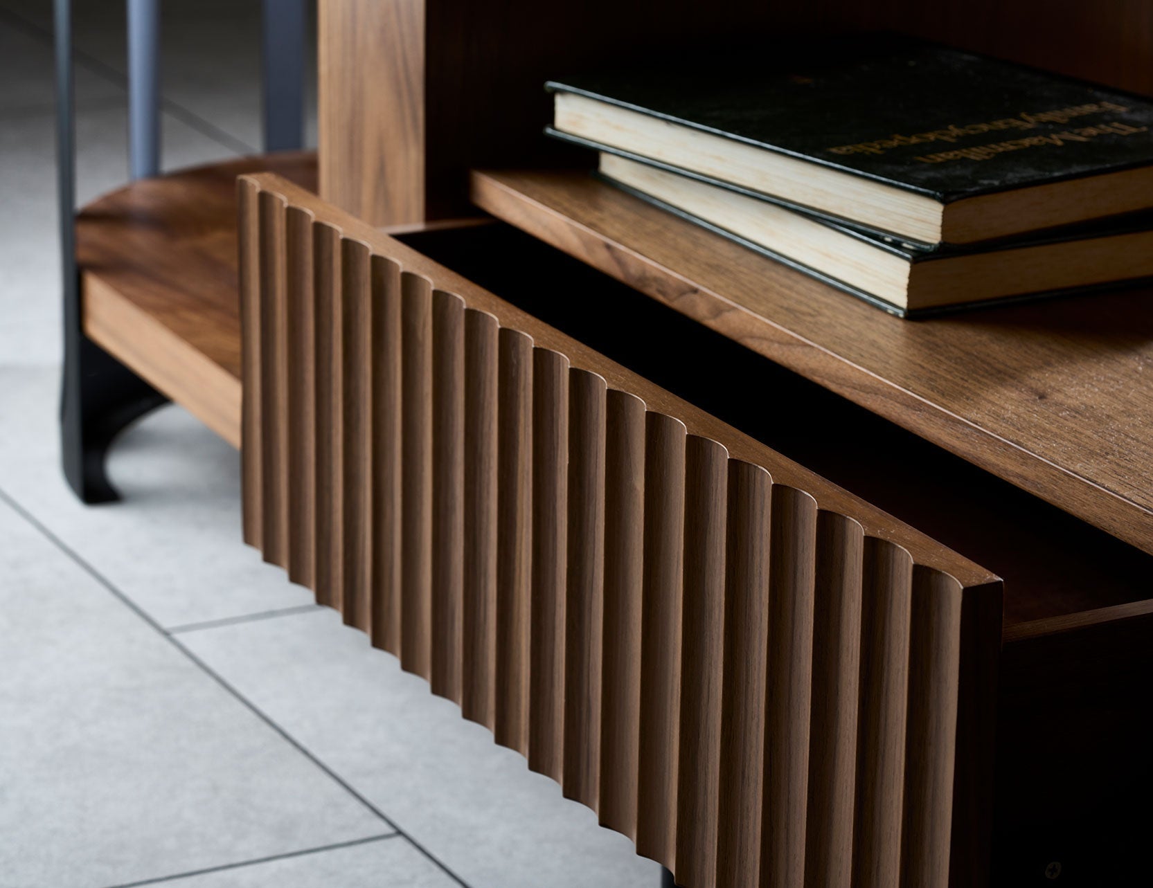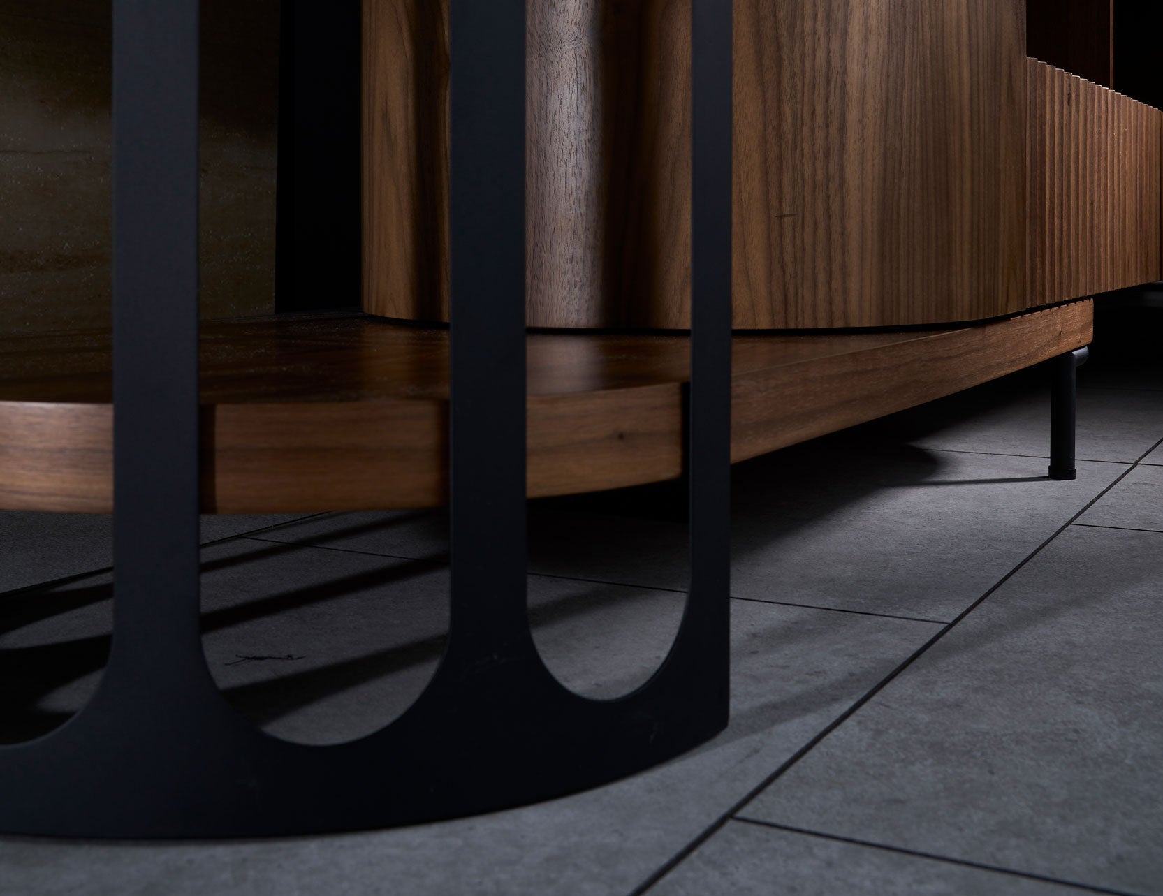 Ce meuble TV exceptionnel attire tous les regards grâce à sa courbe caractéristique. Fabriqué en pierre frittée Nazzo aux veines dorées et plaqué noyer, le meuble TV Fluto est doté de pieds en acier modernes pour une finition remarquable. Ses étagères ouvertes permettent de ranger facilement DVD, consoles de jeux ou accessoires, tout en laissant de la place pour d'autres objets. La surface en pierre frittée est robuste et résistante aux taches, aux éclaboussures et aux rayures. De plus, grâce à sa forme extensible, ce meuble est polyvalent et s'associe facilement à d'autres meubles de votre intérieur.