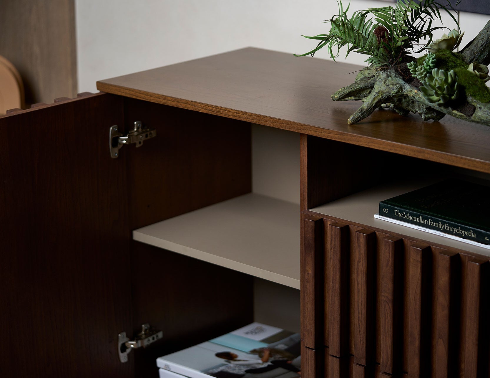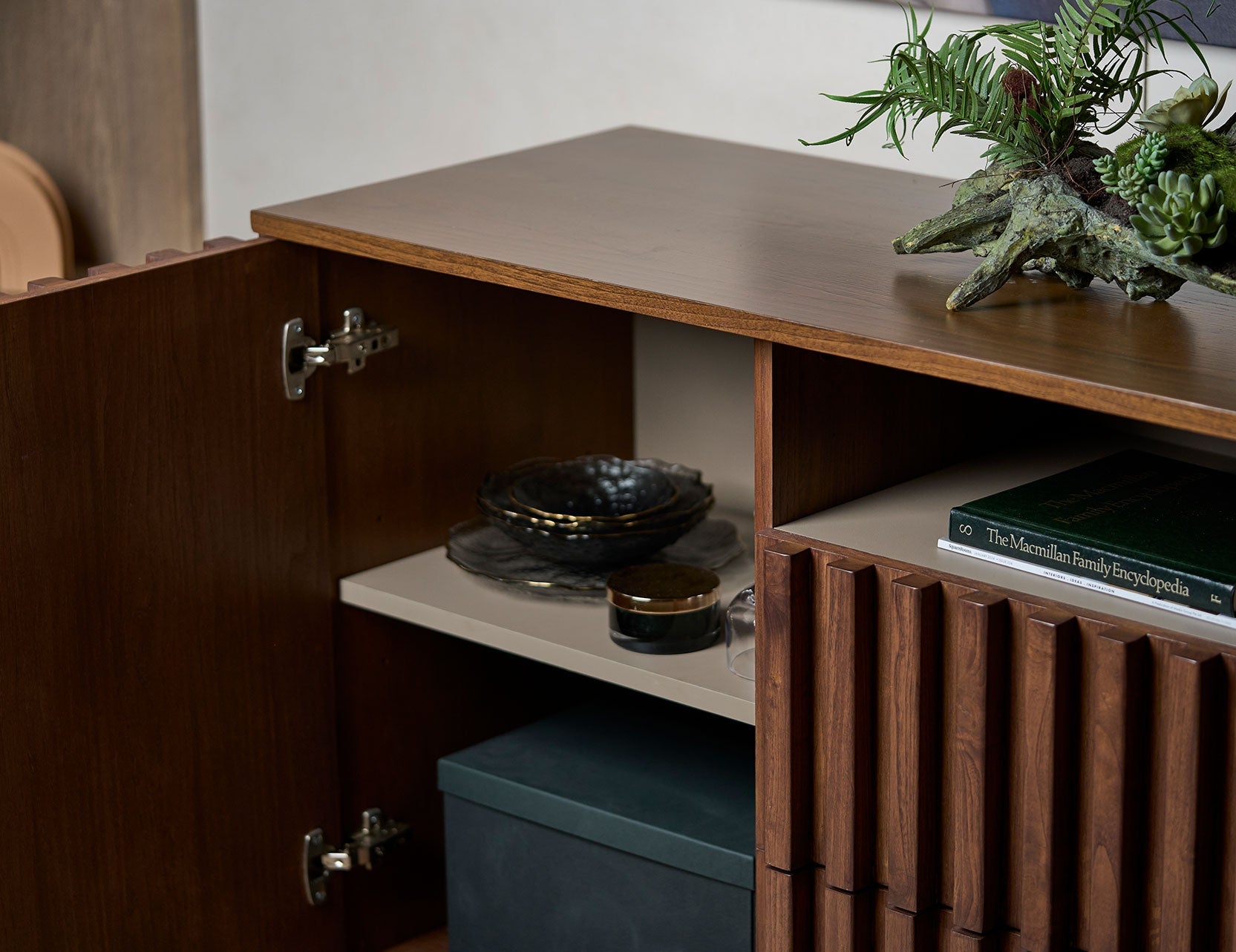 Avec son intérieur gris chaud qui crée un contraste élégant, ce buffet est non seulement élégant à l'extérieur, mais aussi unique à l'intérieur. Doté de pieds en acier robustes et de chants en bois massif, il est conçu pour durer et s'intégrer parfaitement aux intérieurs de taille moyenne à grande.